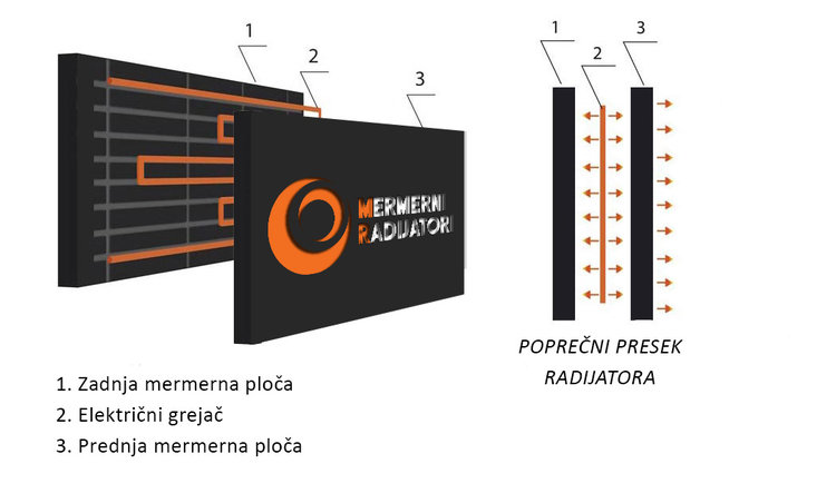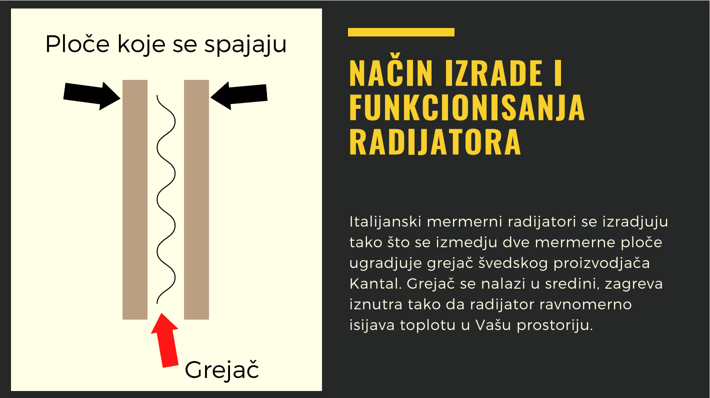 Radijatori se izrađuju tako što između 2 mermerne ploče ugrađuje se grejač “Kanthal” uvoz iz Švedske.